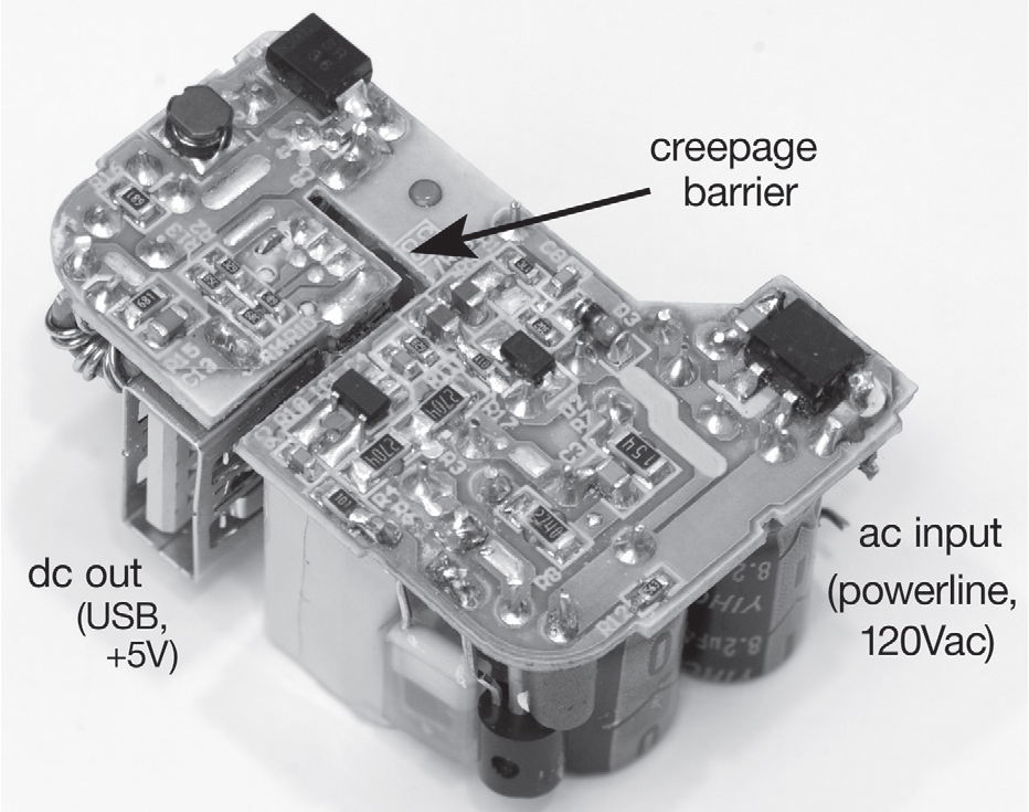 В общем случае воздушный зазор величиной около 2 mm и дистанция по поверхности 4...8 mm достаточны для защиты от потенциала 120 Vac , но есть обстоятельства, влияющие на эти цифры. Примером может служить «степень загрязнения» ( так обозначается наличие потенциально проводящей пыли, капель жидкости и т.д. ). Существуют различные группы безопасности, которым должны соответствовать устройства. Диапазон от «функционального» до «усиленного». Ещё одним фактором является назначение устройства. Стандарты задают одни значения для бытовой техники (IEC 60335 ) и совсем другие, гораздо более жёсткие для медицинских приборов (IEC 60601 ). Подробное обсуждение этой темы выходит за рамки данной книги. Ниже приведены сведения, призванные предупредить разработчика о серьёзности темы электрической изоляции и некоторые приёмы по её обеспечению.