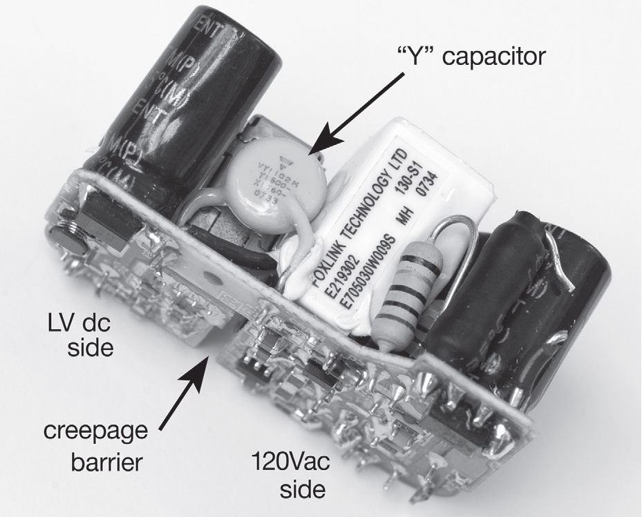 Рис. 9.81 Тот же преобразователь сбоку. Виден Y-конденсатор с широко разнесёнными выводами, обеспечивающими минимальную дистанцию поверхностного пробоя 8 mm . Для сравнения, минимальный зазор составляет всего 1.5 mm