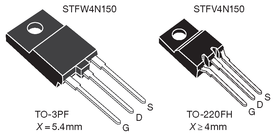 Опасность пробоя сопровождают любую высоковольтную схему, независимо от наличия в ней изоляционного барьера. Приёмы противодействия можно видеть на рис. 9.82 , где изображены два вида корпусов высоковольтных МОП транзисторов. В более крупном TO-3PE (шаг 5.4 mm ) вывод стока имеет дополнительное покрытие материалом корпуса, которое увеличивает дистанцию поверхностного пробоя. В TO-220EH (шаг 2.5 mm ) имеются канавки на корпусе, а выводы разнесены на максимальное расстояние.