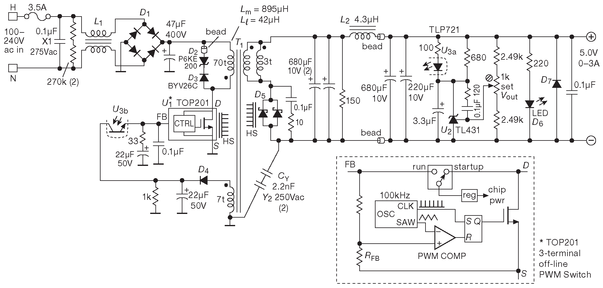В грубом приближении картина выглядит следующим образом. Сетевой выпрямительный мост \( D_1\) заряжает накопительный конденсатор 47 μF 104 , нормированный на 400 Vdc , чтобы выдержать максимальные 265 Vac на входе. С выхода выпрямителя напряжение ( +160 Vdc для 115 Vac или +320 Vdc для 230 Vac ) подаётся на первичную обмотку \( T_1\) ( 70 витков ). Второй вывод обмотки подключается к общей точке с постоянной частотой, но переменной шириной импульса, через интеллектуальный ключ \(U_1\) . Ширина импульса управляется цепью обратной связи через вывод «FB». Напряжение вторичной обмотки ( 3 витка ) выпрямляется диодом Шоттки \( D_5\) по обратноходовой схеме ( т.е. диод заперт на активной части рабочего цикла, когда ключ ЗАМКНУТ). Выходное напряжение фильтруется четырьмя низковольтными накопительными конденсаторами ( общая ёмкость 2260 μF ), образуя изолированное регулируемое напряжение +5 Vdc . Источник использует стабилизацию по вторичной цепи. Половина выходного напряжения \( V_{out}\) сравнивается ИМС \(U_2\) с её внутренним источником +2.50 V , и, если выходное напряжение достигло заданных +5 Vdc , зажигается светодиод оптопары \(U_{3a}\) . Фототранзистор \(U_{3b}\) регулирует ток вывода обратной связи контроллера \(U_1\) , меняя тем самым ширину активной части импульса, чтобы поддержать на выходе +5 Vdc .