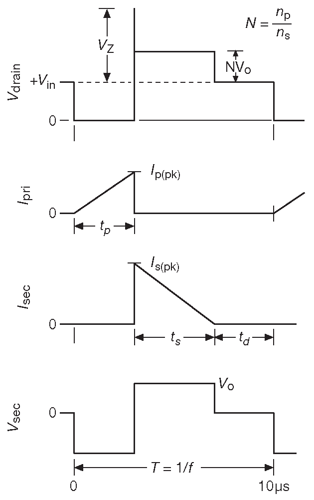 Цифры последуют позднее, а сейчас стоит взглянуть на форму сигналов. Предполагается, что схема работает в режиме разрывных токов, который выводится сам собой в ходе расчётов. Когда ключ находится в проводящем состоянии, напряжение на стоке удерживается на уровне земли. К первичной обмотке трансформатора при этом прикладывается напряжение \(+V_{in}\) , что вызывает линейный рост тока в ней в соответствии с уравнением \( V_{in}=L_M\space\frac{d}{dt}I(pri)\) . Здесь \(L_M\) – «индуктивность намагничивания» первичной обмотки ( индуктивность, которую имеет обмотка, когда все остальные выводы трансформатора висят в воздухе ). Ток увеличивается до некоторого максимального значения \(I_p\) . В этот момент в сердечнике трансформатора накоплена энергия \(E\)=(1/2)\(L_MI_p^2\) . Ключ закрывается, и ток индуктивности начинает течь через вторичную обмотку, передавая на выход накопленную энергию \( E\) . По мере разряда накопленной энергии [* размагничивания сердечника ] ток вторичной обмотки линейно снижается до нуля в соответствии с уравнением \( V_{out}=L_M(sec)\space\frac{d}{dt}I(sec)\) , где \( L_M(sec)=L_M/N^2 \) - индуктивность намагничивания вторичной обмотки 106 . В оставшейся части цикла ток в трансформаторе отсутствует.