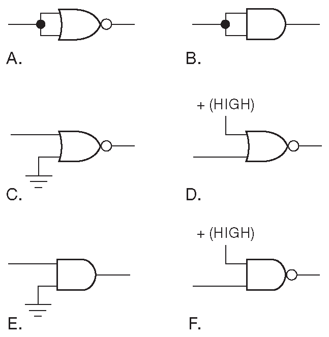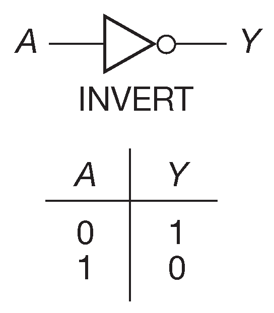 Часто требуется получить логическое дополнение некоторого состояния. Именно для этого и нужен инвертор - вентиль с одним входом и одним выходом (рис. 10.6 ).
