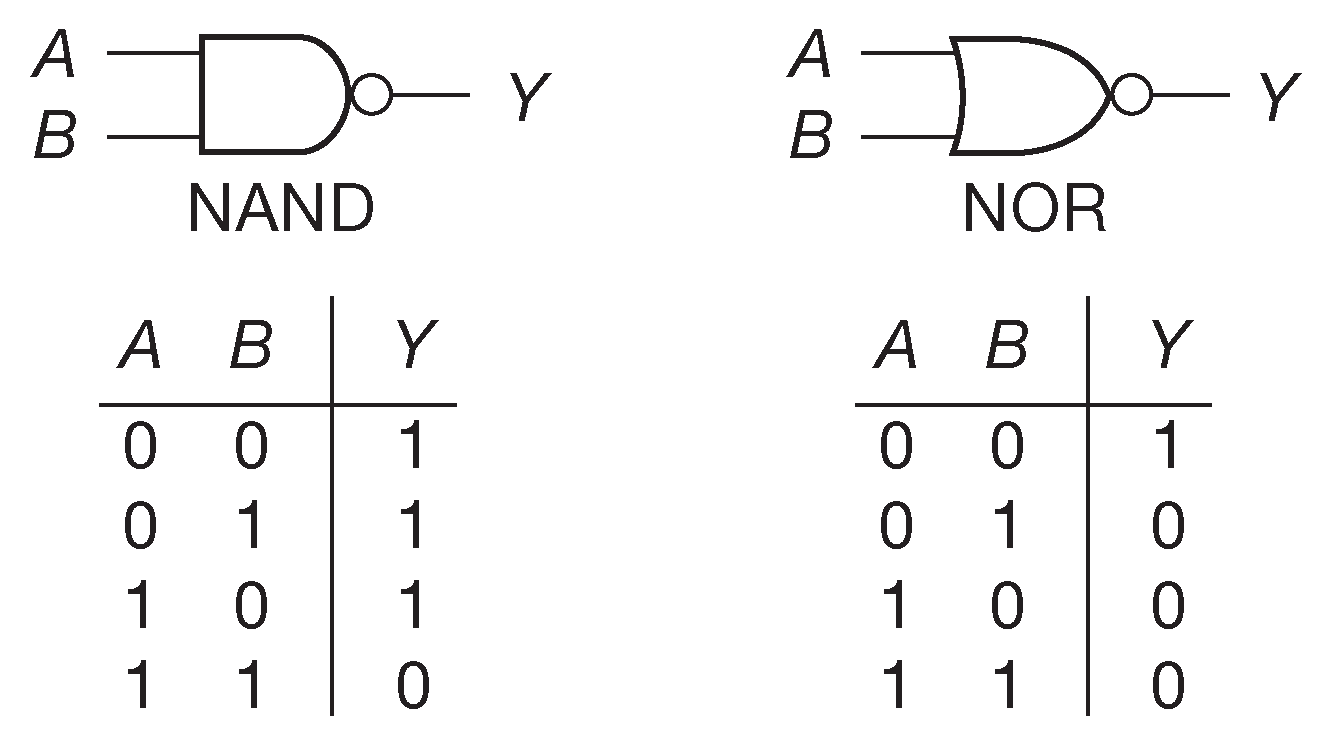 Инверсия может комбинироваться с другими логическими функциями и образовывать элементы «И-НЕ» и «ИЛИ-НЕ» (рис. 10.8 ), которые популярны больше, чем простые «И/ИЛИ». Дело в том, что инверсия позволяет строить на этих элементах любую логическую функцию, о чём позднее ещё будет разговор.
