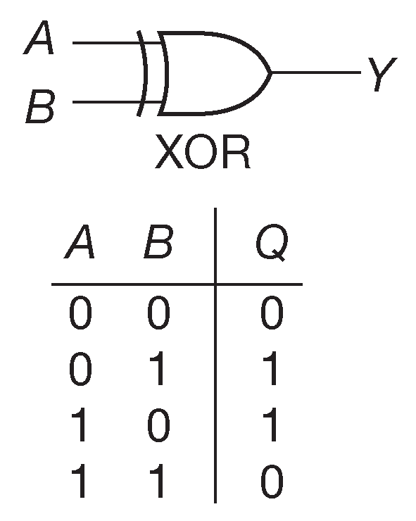 «ИСКЛЮЧАЮЩЕЕ-ИЛИ» ( XOR ) - очень интересная функция (рис. 10.9 ), хотя и не столь основополагающая, как «И» и «ИЛИ». Выход элемента «ИСКЛЮЧАЮЩЕЕ-ИЛИ» будет ВЫСОКИМ, если ВЫСОКИЙ любой из входов, но не оба вместе. Иначе говоря, выход ВЫСОКИЙ, если на входах различные состояния. У этого элемента бывает только два входа 14 . Элемент «ИСКЛЮЧАЮЩЕЕ-ИЛИ» идентичен сумматору «по-модулю-2». В булевой алгебре он имеет символ «⊕», а в языках программирования Verilog и Си обозначается знаком «⋀» 15 .