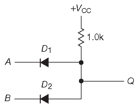 Прежде чем переходить к использованию логических микросхем, посмотрим, как можно реализовать логические функции на дискретных компонентах. На рис. 10.12 показана схема элемента «И». Если какой-то из входов подключить к НИЗКОМУ уровню, то на выходе будет НИЗКИЙ уровень. Выход перейдёт в ВЫСОКОЕ состояние, только если оба входа имеют ВЫСОКИЕ уровни. Схема рабочая, но недостатков у неё много.
