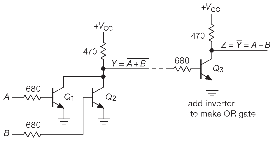 Рис. 10.13 Резисторно-транзисторная логика. Из элемента «ИЛИ-НЕ» и дополнительного инвертора можно собрать «ИЛИ»