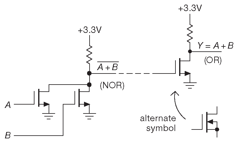 Логические схемы на биполярных транзисторах практически полностью вытеснены МОП логикой. На рис. 10.14 показан тот же элемент «ИЛИ», но с ключами на n-канальных МОП транзисторах. МОП вариант не потребляет ток по входу, но его входная ёмкость потребует обеспечить ток перезарядки при смене состояния. Но и у такой схемы остаются недостатки. Скорость по-прежнему ограничена, а потребляемая мощность велика ( из-за резистивной подтяжки ). Обе проблемы красиво решает комплементарная МОП ( КМОП ) схема в симметричном включении ( см. обсуждение в §3.4.4.A ).