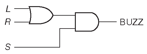 Давайте изобразим схему, которая предлагалась в качестве примера в Части _1 [* §1.9.1.F ] и _2 [* §2.6.3 ] . Она подаёт сигнал об открытой двери, если водитель занял своё место. Схема станет очевидна, если сформулировать задачу правильно: «Выдать ВЫСОКИЙ уровень, если левая ИЛИ правая дверь открыта И водитель сидит». Получаем Q=(L+R)S . В виде схемы решение показано на рис. 10.15 . Выход элемента «ИЛИ» принимает ВЫСОКОЕ состояние, если какая-либо ( или обе ) дверь открыта. В этом случае и при сидящем водителе выходной сигнал Q станет ВЫСОКИМ. Дополнительный транзистор поможет запустить таким сигналом звуковой излучатель или активировать реле 18 .