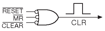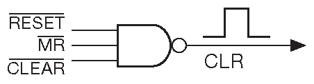 Есть два пути решения проблемы. Первый - описанный ранее - выбрать вентиль, исходя из требуемого выходного уровня. Например, если требуется знать, что хотя бы один вход из трёх НИЗКИЙ, то надо брать 3-входовой элемент «И-НЕ». Кое-кто даже проектирует так схемы. В таком случае рисуется элемент «И-НЕ», хотя на самом деле выполняется операция «ИЛИ-НЕ» для активных низких входов. В этом случае схема будет выглядеть как на рис. 10.19 . Здесь /CLEAR, /MR и /RESET могут быть активными низкими сигналами, приходящими из разных точек схемы. Выход CLR - активный высокий, на котором появляется ВЫСОКИЙ уровень, когда какой-нибудь из входных сигналов переходит в НИЗКОЕ ( ИСТИННОЕ ) состояние.
