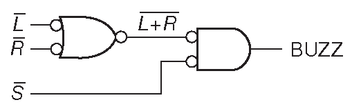 Во-первых, надо знать, что какой-то сигнал от дверей имеет НИЗКОЕ состояние, т.е. нам требуется отлавливать состояние «оба входа ВЫСОКИЕ». Значит, требуется элемент «И». Подаём /L и /R на входы элемента «И». Его выход будет принимать НИЗКОЕ состояние, если какой-либо вход НИЗКИЙ. Назовём этот сигнал «/Какая-то-дверь». Теперь требуется, чтобы выполнялось условие /Какая-то-дверь= НИЗКИЙ и /S=НИЗКИЙ, т.е. требуется отлавливать состояние «оба сигнала НИЗКИЕ». Это элемент «ИЛИ». Схема показана на рис. 10.16 . Используется элемент «ИЛИ-НЕ», вместо вентиля без инверсии, чтобы на выходе схемы сигнал повторял логику схемы 10.15 : линия Q переходит в ВЫСОКОЕ состояние, когда заданное условие выполняется. Схема выглядит довольно странно: вместо «ИЛИ» стоит «И» и наоборот, если сравнивать со схемой 10.15 . Этот запутанный вопрос прояснит §10.1.7 , но сначала разберитесь с упражнением.