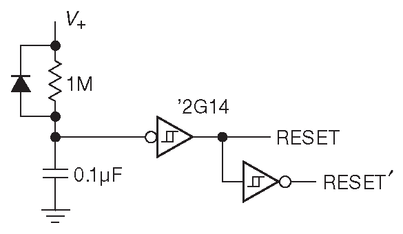 Близко к первой проблеме примыкает вопрос состояния системы при запуске. Наличие какого-то сигнала, приводящего систему в исходное состояние - полезная штука. В его отсутствие устройство может вести себя странно в первый момент после включения [* это может случиться даже с аналоговыми схемами, см. §9.10.1.A ] . Одним из решений может быть задержка на RC цепочке с триггером Шмитта ( рис. 10.94 ). К сожалению, эта схема требует дополнительных компонентов и не реагирует на кратковременную просадку питания.
