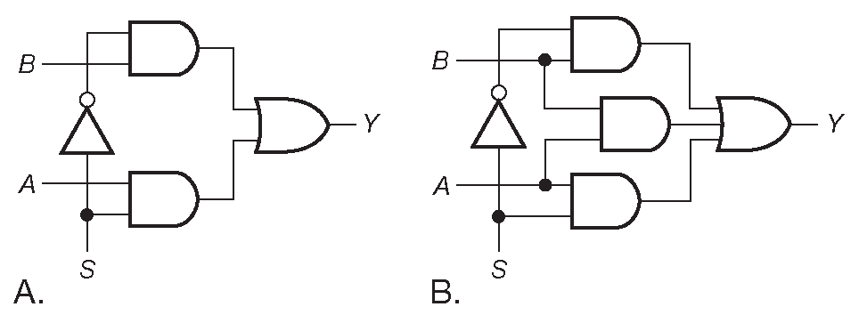 Рис. 10.96 Введение избыточной логики избавляет от иголок из-за логических гонок в 2-входовом мультиплексоре