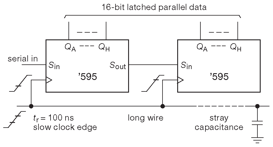 Фазовый сдвиг фронта возникает, когда имеется тактовый сигнал с пологими фронтами, который подаётся на несколько микросхем, сидящих на одной протяжённой тактовой линии ( рис. 10.97 ). В данном случае это 16-битовый регистр, собранный из 8-разрядных сдвиговых регистров ’595. На тактовый вход подаётся сигнал с пологими фронтами. Плавный фронт вызван емкостной нагрузкой на слабом выходе тактового сигнала ( это может быть вывод микроконтроллера ). Проблема в том, что у первого регистра порог переключения может быть ниже, чем у второго ( такая разница имеется всегда и обусловлена допусками при производстве ). Низкий порог приведёт к более раннему сдвигу данных в первом регистре. При этом может быть потерян выходной бит первого регистра. КМОП схемы имеют достаточно большой разброс порогового уровня, что только усложняет ситуацию ( спецификация говорит о разбросе от одной третьей до двух третьих напряжения питания, и она точно отражает действительное положение ). Исправить ситуацию можно, раздавая тактовый сигнал близкорасположенным быстрым буфером с минимальной ёмкостью на выходе. ( Ещё один способ борьбы со сдвигом фазы фронта - добавление задержки на линию данных, связывающую последовательные регистры в цепочке. [* Волнистые проводники на печатных платах видели? Это оно ] . Но такой приём не снимает требования к наличию качественного тактирования ).
