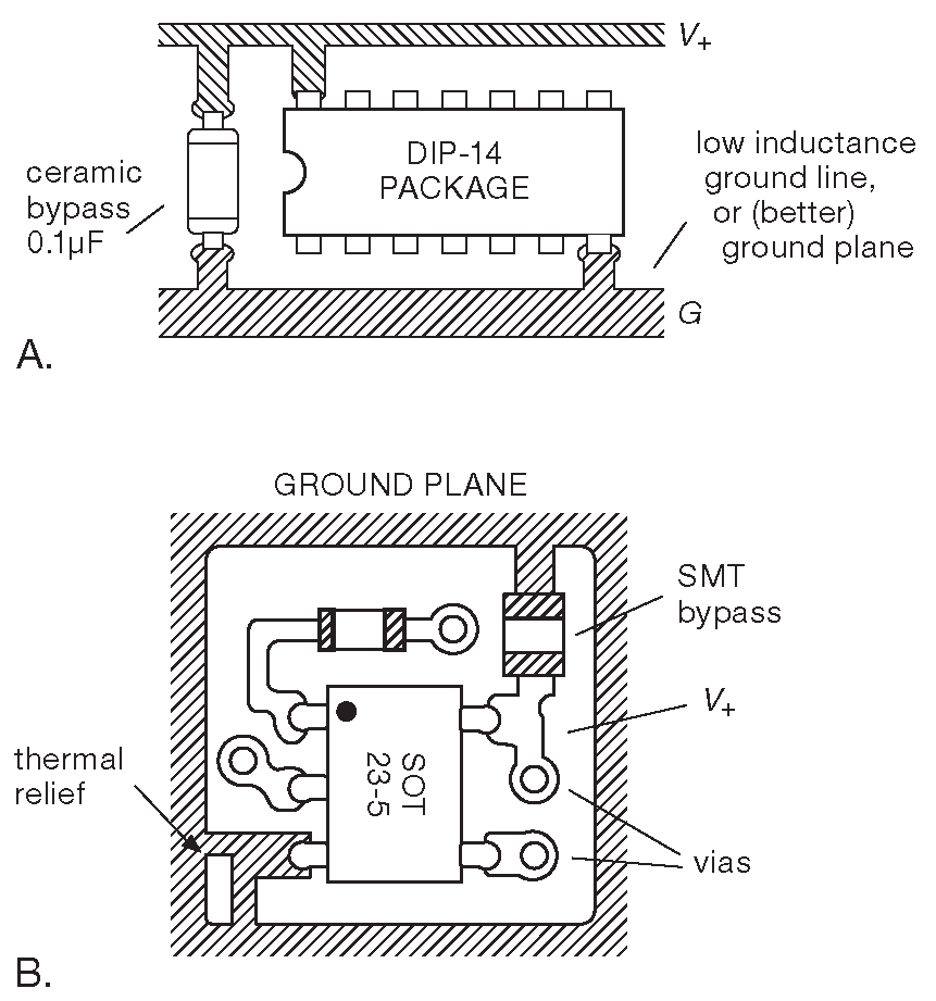 Рис. 10.98 Использование мощных низкоиндуктивных линий земли и активное употребление развязочных конденсаторов - хорошее решение для любых схем. (A) Для недорогих двухслойных плат можно использовать гребёнчатую разводку питания. (B) Ещё лучше потратиться на многослойную плату, отвести сплошной слой земли и ставить конденсаторы в корпусах для поверхностного монтажа. Верхний слой обычно оставляют для сигнальных линий, а слои питания располагают внутри. ( Здесь слой питания расположен в верхнем слое для наглядности, но такой вариант подходит для двусторонних плат )