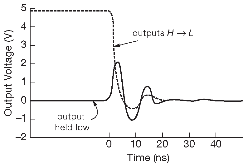 Интересной специфической особенностью КМОП являются выбросы в цепи земли . Быстрые КМОП выходы, нагруженные на большую ёмкость, вызывают сильные переходные токи в земляной шине, приводящие к колебаниям потенциала земляного вывода микросхемы и вместе с ним к колебаниям НИЗКОГО уровня на выходах, влияющие на непричастных соседей по кристаллу. На рис. 10.99 показано, что происходит. Обратите внимание на масштабы явления: выбросы от 1 до 2V не являются чем-то необычным! Если учесть, что длительность фронта 3 ns , то перепад 5V на нагрузке 50 pF требует \(I=C(dV/dt)\) =83 mA тока, а 8-битный буфер может работать на 8 таких нагрузок одновременно ( общий ток 2/3A ! ) такая картина не должна удивлять. Когда первые микросхемы AC(T) только появились, их начали упаковывать в корпуса DIP с традиционной угловой разводкой питания. Проблема выбросов по земле оказалась настолько острой, что её оказалось проще обойти. В итоге появилась новая серия с выводами питания по центру корпуса для снижения индуктивности. Кроме того, производители озаботились снижением скорости нарастания при переключении ( иногда называемой скоростью фронта ), а значит, и снижением тока перезарядки емкостей \(C(dV/dt)\). В семействах «AC(T)Q» ( “Q” - “quiet” ) проблема по большей части преодолена при очень небольшом снижении быстродействия.