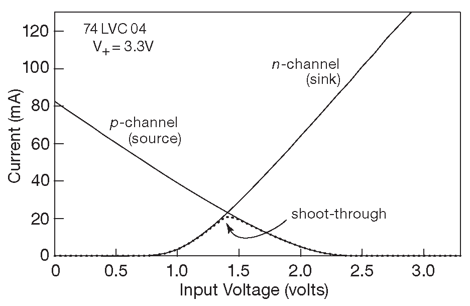 Висящие в воздухе входы - очень неприятная штука, даже если они относятся к неиспользуемому вентилю. Болтающийся вход смещается к середине питания, открывая p- и n-канальный транзистор одновременно. Появляется ток «класса-A», который превращается в ток покоя микросхемы ( у КМОП нулевой ток покоя, не забыли? ), а иногда просто выводит её из строя. Свободный вход может вызвать генерацию. Что происходит, видно на рис. 10.100 , где показаны результаты независимого измерения принимаемого и отдаваемого тока у одной секции 74LVC04 при +3.3 V . Если потенциал на входе оказывается ближе 0.7 V к любой линии питания, соответствующий МОП транзистор полностью закрывается. Но в промежутке между этими точками есть какая-то сквозная проводимость. На рисунке показана пиковая величина 20 mA при \(V_{IN}\) ≈ 1.4 V или 28 mW на один инвертор. Если в таком положении будут все шесть вентилей, то корпус начнёт рассеивать ∼200 mW . При питании +5V нагрев может разрушить кристалл.