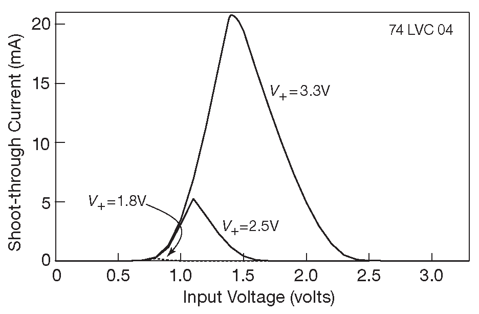 Рис. 10.100 Ток, потребляемый одним элементом сшестерённого инвертора ’LVC04 ( пунктир ), как функция напряжения на входе. «Сквозной ток» - синоним для состояния одновременной проводимости ( короткого замыкания ) каналов обоих транзисторов, вызванного промежуточным уровнем сигнала на входе