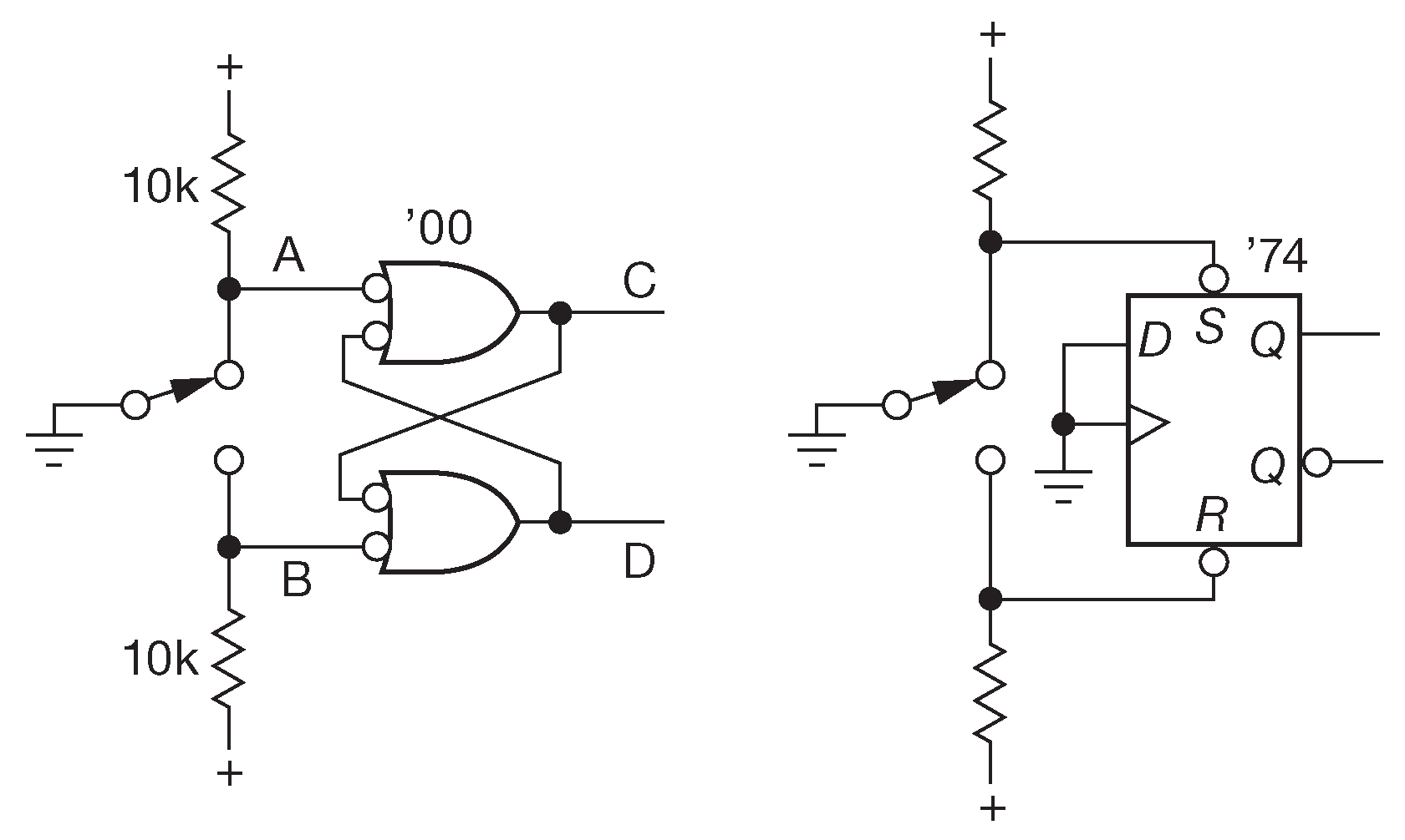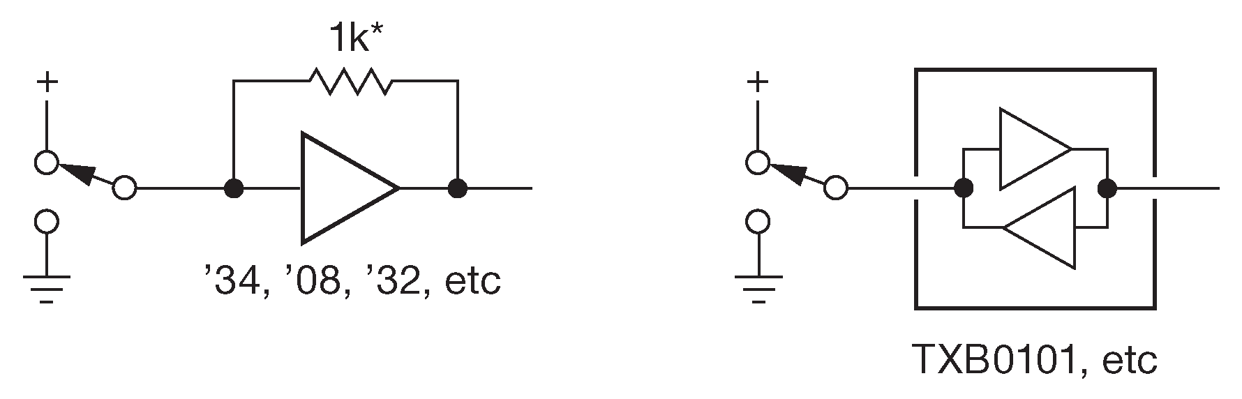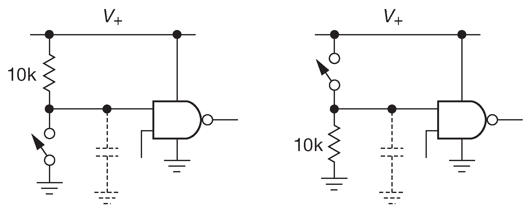 Управлять цифровыми входами с переключателей, клавиатур, компараторов и т.д. легко, если принимать во внимание параметры используемого семейства. Проще всего получить правильный логический уровень с помощью резистора подтяжки на питание или землю ( рис. 12.13 ). Для КМОП логики работают оба варианта подтяжки, потому что входы ток не потребляют, а порог лежит в диапазоне от 0.3 до 0.5 \( V_+\) . Удобно заземлить один из контактов переключателя, но схема будет работать, если при замыкании кнопки на вход будет подаваться ВЫСОКИЙ уровень, потому что резистор на землю работает столь же хорошо. А вот с биполярными ТТЛ картина иная. Их входы являются источниками заметного тока ( в состоянии НИЗКИЙ 74F’ выдаёт 0.6 mA ), поэтому здесь уместна только конфигурация с резистором на питание и заземлённым ключом.