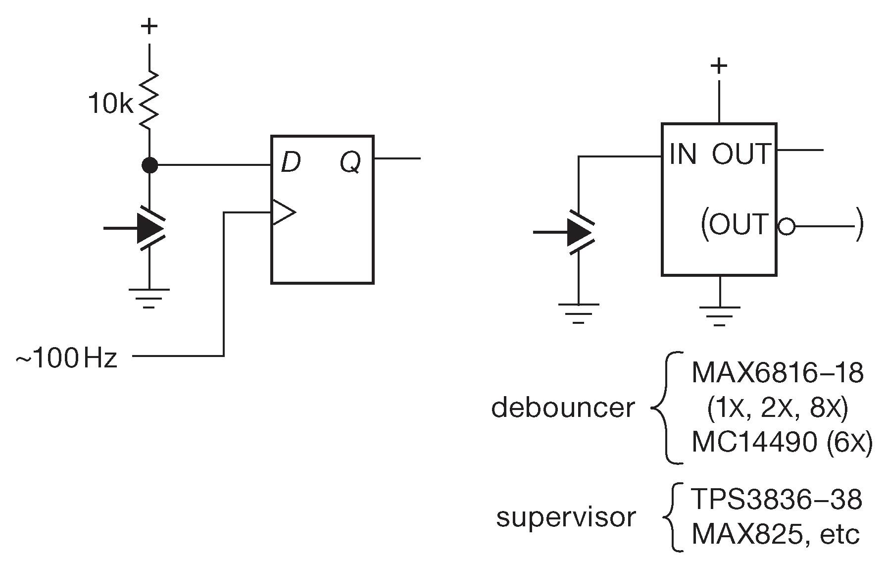 Рис. 12.19 Схемы защиты от дребезга с тактированием. Самый простой вариант - простой D-триггер, тактируемый медленным сигналом. Есть методы и лучше, например, кристаллы, имеющие встроенную защиту типа MAX6816/7/8 и MC14490 или TPS3836/7/8