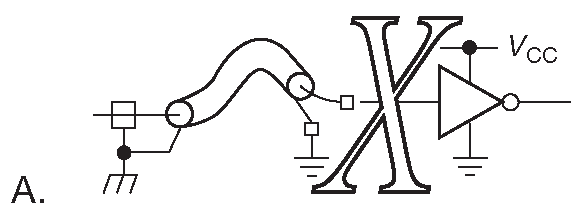 Во всех примерах выше молчаливо предполагалось, что сигнал, приходящий на логический вход, ведёт себя прилично, не содержит выбросов, не имеет деструктивных наклонностей и не пытается сжечь всё вокруг. Так бывает не всегда. С сигналами, приходящими из внешнего мира, можно хлебнуть горя горького, если провод от внешнего соединителя подходит прямо к ноге логической микросхемы ( рис. 12.21A ). Распространённым источником выбросов в линиях служат заряды статического электричества, активно образующиеся и накапливающиеся в сухую погоду. Треск, слышимый при снятии свитера означает, что тело приобрело статический потенциал в несколько киловольт. Это электричество накапливается в ёмкости человеческого тела ( около 100 pF ) и может разрядиться в сигнальную линию в момент подсоединения разъёма или случайного прикосновения к печатной плате без предварительной разрядки через заземлённый контакт.