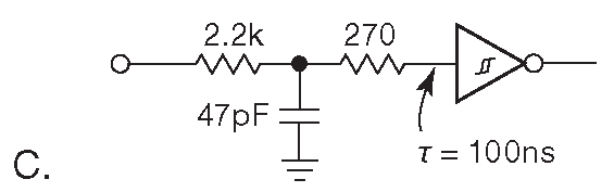 Вариант 12.21C использует RC фильтр для сглаживания пикового входного тока. Чтобы защита была эффективной постоянная времени должна соответствовать таковой для модели человеческого тела, т.е. 100 ns или около того ( входной резистор должен быть сравним с модельным номиналом - 1.5 kΩ ), а вход должен принадлежать триггеру Шмитта.