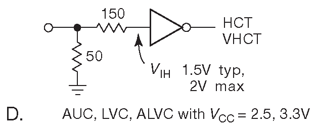 Цифровые микросхемы имеют на входе цепь защиты от перенапряжения. Она состоит из диода, подключённого к земле, и либо второго диода на шину V+ , либо ( для 5V-совместимых семейств ) ограничительного стабилитрона. Раздел «Абсолютные максимальные значения» в справочных данных указывает границу, к которой нельзя приближаться ( для LVC’ приводятся цифры –0.5 V ≤ \( V_{in}\) ≤ +5.5 V , независимо от уровня напряжения питания, т.к. серия является «5V-совместимой» ). Но часто повреждения наносит входной ток , что специально подчёркнуто в той же таблице: «Входные и выходные отрицательные уровни напряжений могут быть превышены при условии не превышения допустимого входного и выходного тока». Эти токи ( входного и выходного ограничения ) указаны и в данном случае составляют 50 mA max. Поэтому правильнее всего будет удерживать входное напряжение в указанных пределах, но, если имеется последовательный резистор, вполне допустимо сдвигать потенциал вверх или вниз ( рис. 12.21B ).
