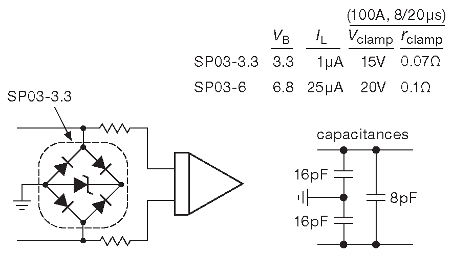 Рис. 12.21 (B) Защита логических входов от деструктивных воздействий. Ограничительные диоды на Vcc и на землю или антистатическая сборка с последовательным токоограничительным резистором. На вход приходит энергия 0.1 μJ при исходной величине 15 μJ Рис. 12.23 Диодная сборка для защиты от «статики». В данном случае сборка производства Littel-fuse имеет очень низкий импеданс и позволяет защитить дифференциальные или несимметричные входы. Внутренний стабилитрон определяет напряжение ограничения. Можно приобрести сборки, рассчитанные на меньший ток, но с гораздо меньшей паразитной ёмкостью. Например, 5-вольтовая CTLTVS5-4 фирмы Central Semiconductor имеет максимальную ёмкость на землю 0.8 pF и 0.4 pF между линиями при 0V , пиковый ток 2.5 A , включает два защитных моста в корпусе