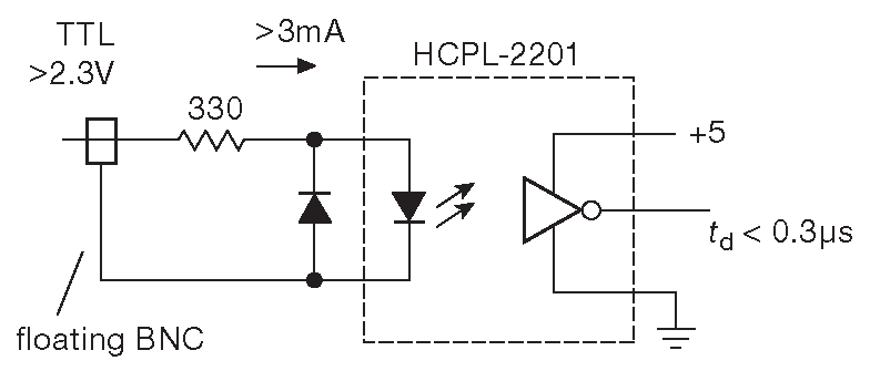Наконец, если требуется железобетонная защита, можно поставить оптоизолятор ( рис. 12.24 ). В таком включении гальваническая связь логического входа с внешним миром отсутствует ( обратите внимание на плавающий разъём BNC ). Оптоизоляторы способны разделять потенциалы величиной много киловольт и встретятся ещё раз в §12.7 . Стоит обратить внимание на встречно-параллельный диод и токоограничивающий резистор. Диод часто не ставят, но это ошибка.