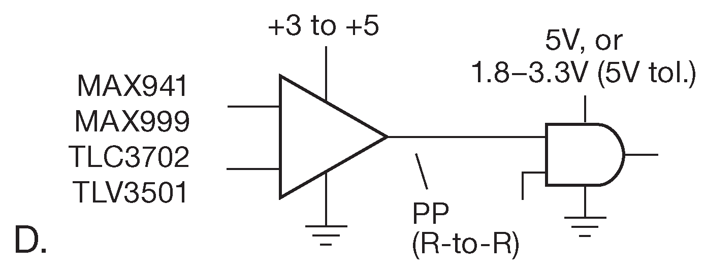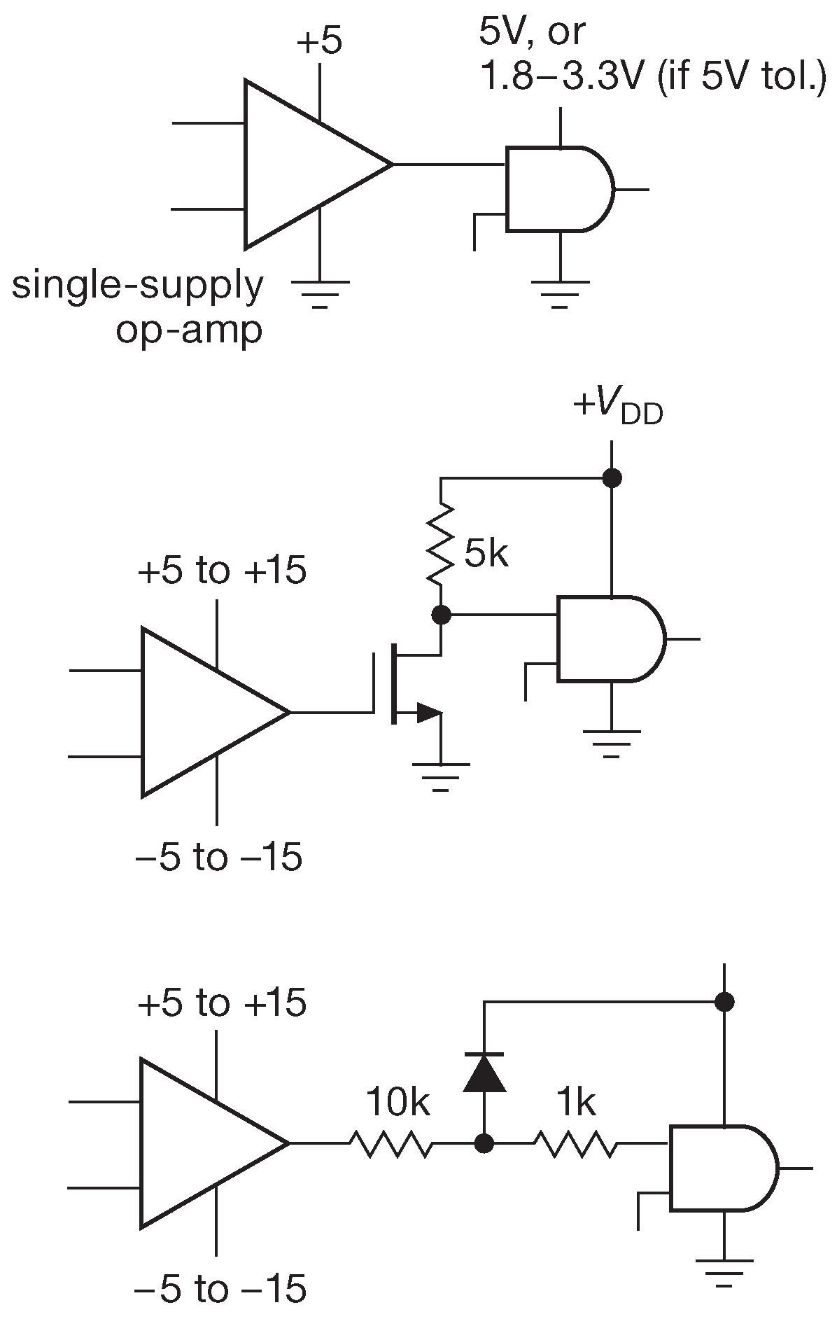 Типовые схемы показаны на рис. 12.29 . Если ОУ запитан от того же напряжения, что и цифровые схемы ( т.е., скорее всего, такой ОУ относится к виду RRO и имеет полный диапазон питания на выходе ), его можно подключить к цифровому входу напрямую. На рисунке используется либо 5-вольтовая логика, либо ИМС с «5V-совместимыми» входами, запитанная от меньшего напряжения ( LV, LVC или LVX, см. рис. 12.3 ). Если размах сигнала ОУ больше питания логики или уходит ниже её нулевого уровня, требуется схема удержания входного напряжения в допустимых границах. Одним из решений будет инвертор на n-МОП транзисторе. Пойдёт и пассивная ограничивающая цепь с защитным диодом, подсоединённая к питанию логической части. Авторы не являются поклонниками последнего метода, т.к. он требует трёх компонентов ( и ухудшает время переключения ), но схема рабочая. Независимо от выбранного способа, надо учитывать, что на выходе операционного усилителя присутствует аналоговый сигнал со скоростью нарастания, ограниченной обратной связью [* не внешней, так внутренней ] . Он меняется гораздо медленнее, чем нормальный логический сигнал. Другими словами, не стоит ждать чистого переключения. В целом это вполне допустимый способ приведения выхода ОУ к логическому значению.