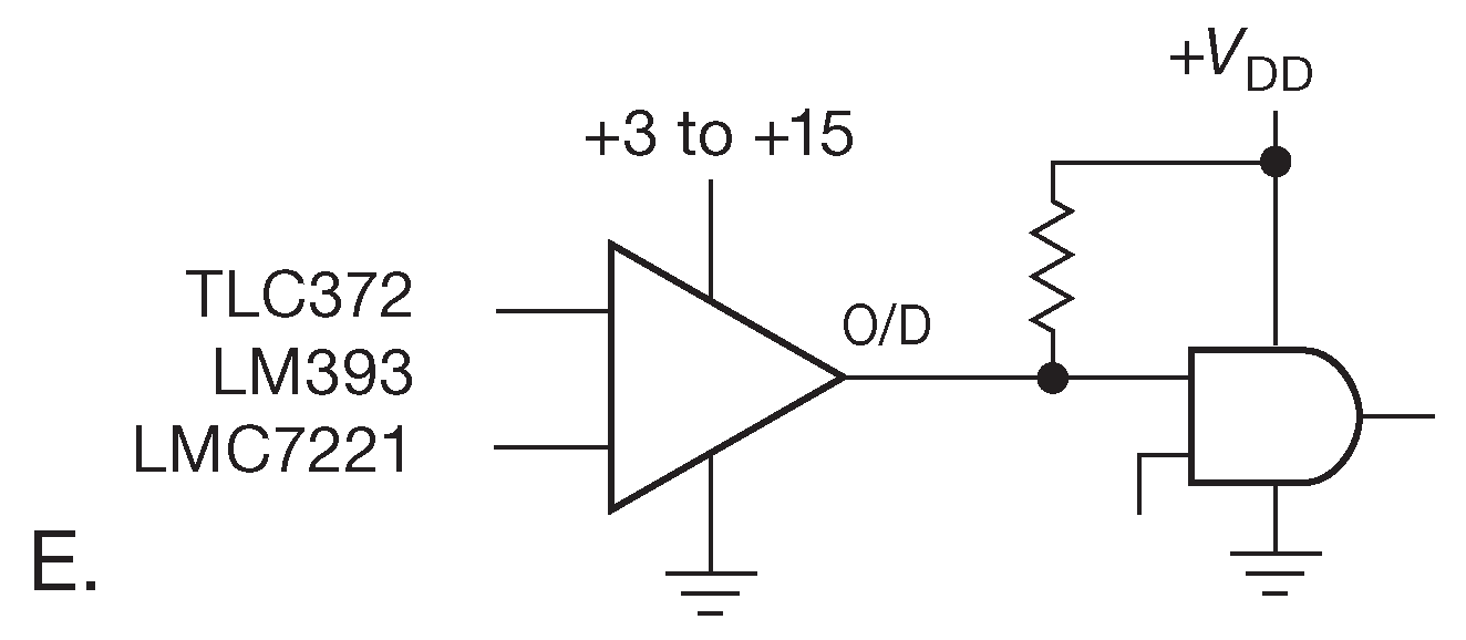 Компараторы ( и иногда операционные усилители ) вместе с аналого-цифровыми преобразователями являются обычным источником входных сигналов для цифровых схем ( см. §4.3.2.A ). Если в схеме стоит микроконтроллер ( Часть 15 ), то все проблемы сопряжения уже решены разработчиком микросхемы. Но иногда требуется подключить компаратор ( или ОУ ) к логическому входу. Здесь нет никаких трудностей, но требуется учитывать допустимый диапазон входных сигналов ведомой цифровой схемы. Рассмотрим несколько примеров ( здесь удобно пользоваться данными из табл. 12.1 на стр. 812 и табл. 12.2 на стр. 813 , дабы не упускать деталей обсуждения ).