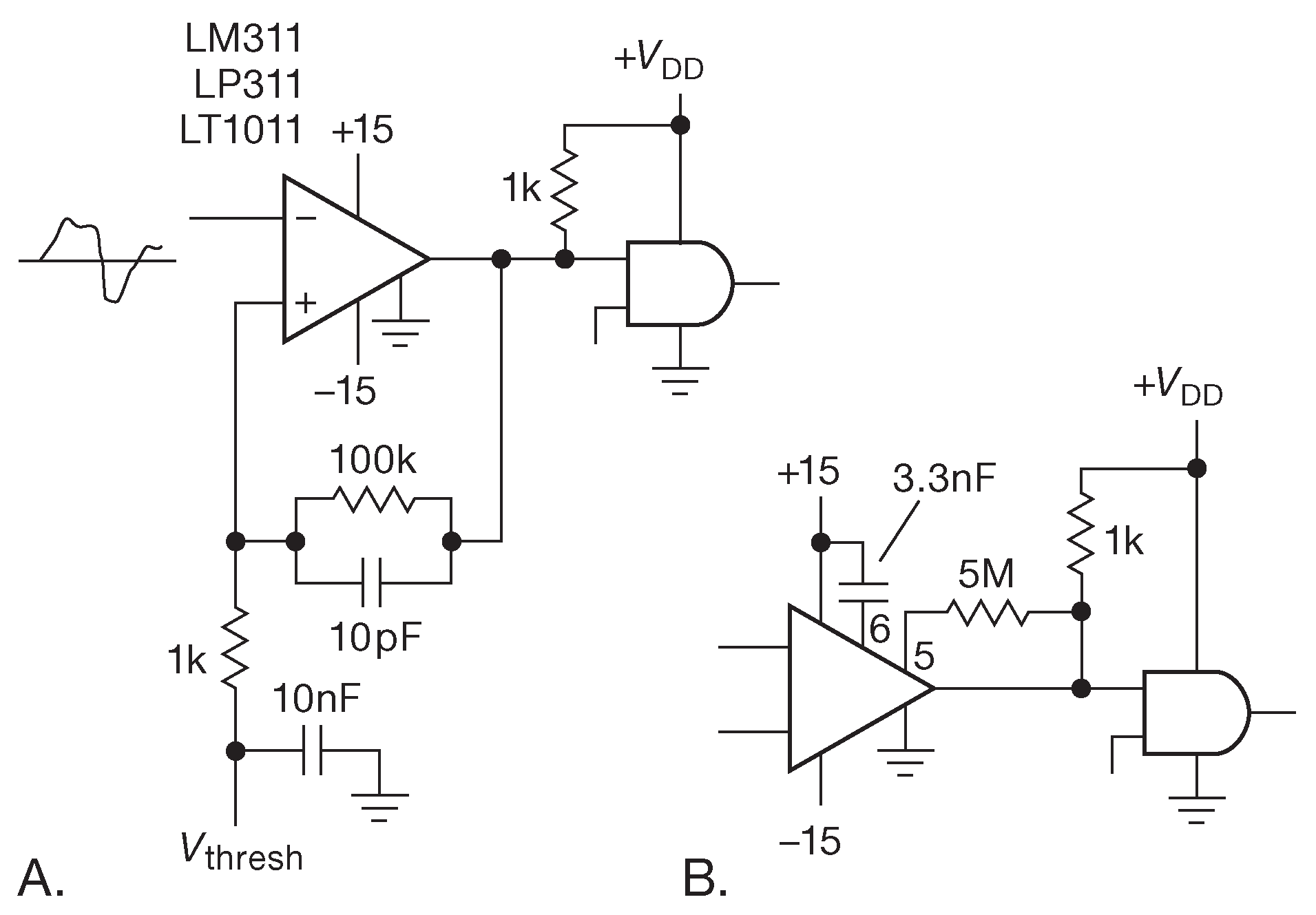 Рис. 12.26 Пороговый детектор с гистерезисом. (A) Универсальная схема, подходящая для любого компаратора. (B) Альтернативный вариант, использующий особенности LM311