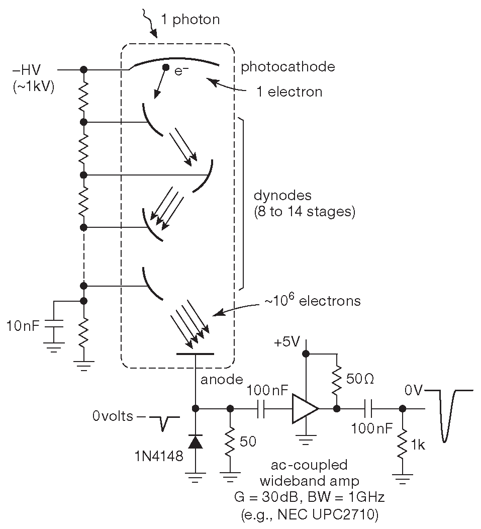 Кстати, уместно будет сказать пару слов о фотоумножителях . Это чувствительные и быстрые детекторы света ( парочку можно видеть на рис. 12.71 ), которые используют каскад усиливающих электронный пучок электродов ( динодов ). Они могут превратить один фотоэлектрон, который с вероятностью 20% возникает при попадании фотона в фотокатод, в компактную группу \(10\space^5...10\space^6\) электронов. Т.е. сигнал не вышедший за пределы детектора уже усилен до степени, когда шумы перестают представлять проблему: миллион электронов в 1 ns это целых 1.6 mA !