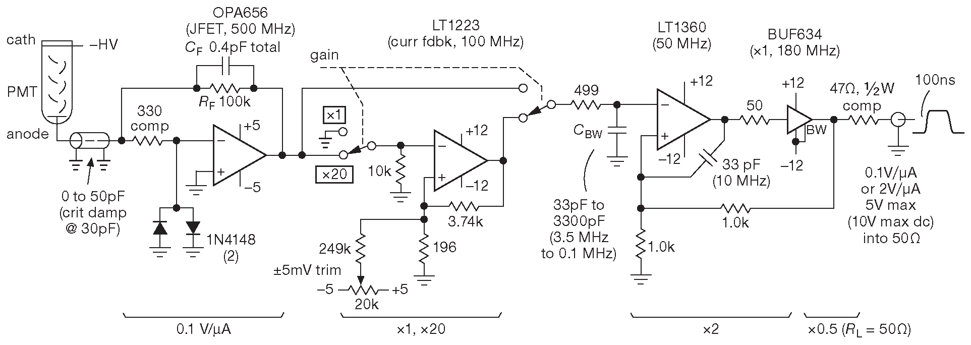 Если же вам надо точно измерять уровень очень слабого света, а наносекунды не важны, то, возможно, подойдёт ограниченный по полосе «интегрирующий» усилитель, похожий на схему 12.83 42 . В ней отличный ( почти уникальный ) OPA656 преобразует анодный ток в напряжение. Это широкополосный операционный усилитель с низким входным током ( ПТ на входе ). Полоса нужна всего несколько мегагерц, а ставить приходится быстрый ОУ ( объяснения в §8.11 и §X4.3 ). Требования к полосе и шуму заставляют удерживать входную ёмкость на возможно более низком уровне и выбирать стабилизирующий конденсатор обратной связи \( C_F\) аккуратно.