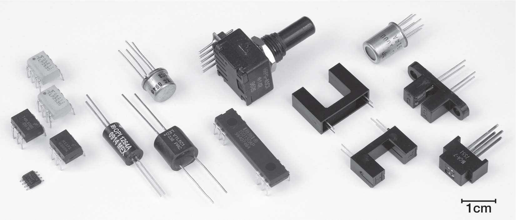 Рис. 12.84 Оптоэлектроника: изоляторы и датчики. Пять микросхем слева - оптоизоляторы. Они содержат пару светодиод-фотодиод, а в некоторых случаях предоставляют в довесок к ним логический выход и даже логический вход. Хорошо работают до разницы потенциалов несколько киловольт. Рядом лежит цилиндрический компонент, гарантирующий изоляцию до 10 kV ( а удлинённая версия на рис. 12.71 - до 50 kV ). Овальный в сечении тёмный предмет и металлический корпус над ним - фоторезистивные элементы на основе CdS, аналогичные по действию с датчиками на рис. 12.80 . Длинная микросхема без промежуточных ножек в центре - ISO150 - цифровой изолятор с емкостной связью. Эта многоножка чужая здесь, но выглядит симпатично. Три предмета с промежутками посередине справа - позиционные датчики, работающие на прерывание луча. Похожий предмет, но без зазора, - сенсор, работающий на отражение. На отражение работает и сканер штрих-кодов - металлический цилиндр с линзой на крышке. Наконец, в центре сзади - панельный оптический энкодер, выдающий 120 квадратурных циклов за оборот