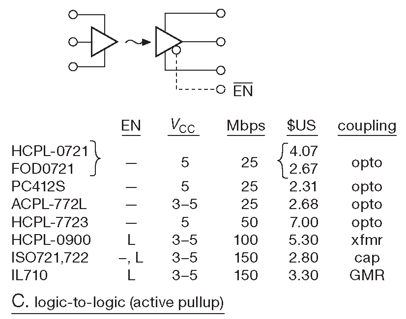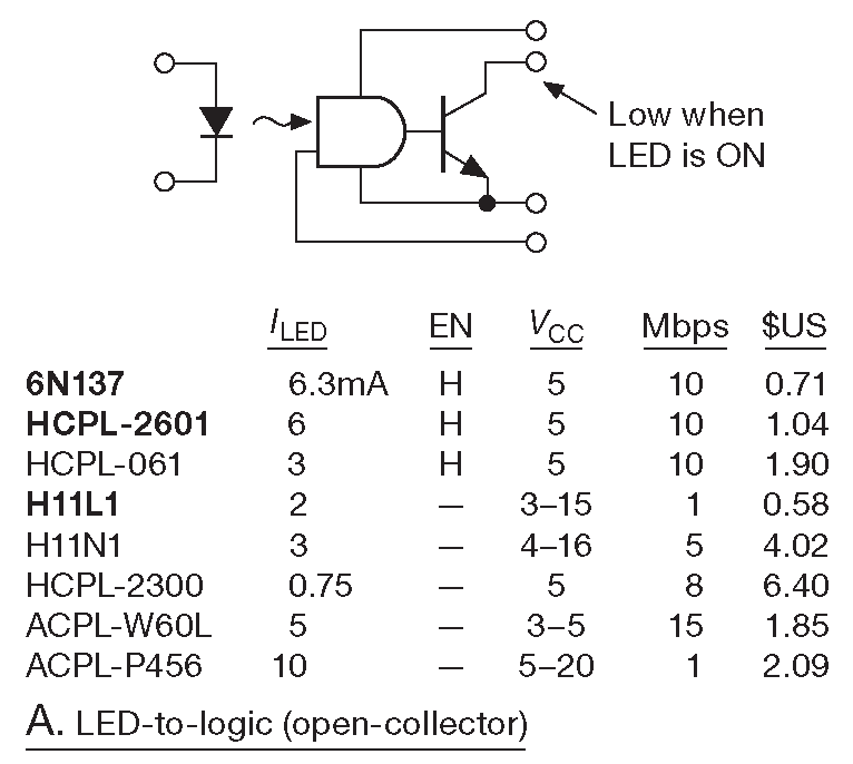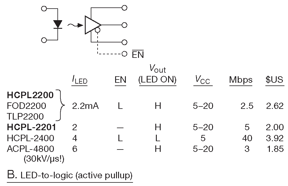 Описанные оптопары хороши, но несколько раздражают необходимостью обвязки из дискретных компонентов и на входе, и на выходе. Более того, требуемый светодиоду ток может превышать возможности некоторых логических семейств, а пассивная подтяжка на выходе замедляет переключение и ухудшает помехоустойчивость. Эти недостатки были исправлены в «логических» оптопарах. ИМС 6N137 и её последователи ( рис. 12.86A и 12.86B ) прошла только полпути, оставив голый светодиод на входе, но включив буферную логику на выходе. Вход по-прежнему нуждается в токе ( по спецификации переключение гарантируют 6.3 mA ). Тем не менее, на выходе чистый логический сигнал, пусть даже и с открытым коллектором, и скорость 10 Mb/s . Обратите внимание, выходная сторона требует питания +5V . В списке есть микросхемы со сниженным током светодиода, среди которых классические H11L1 и H11N1, получившие имена ещё при General Electric - первопроходце оптоэлектронного направления и счастливо обретшие популярность в возрасте «давно за 30». К сожалению слаботочные и быстродействующие варианты стОят достаточно дорого.