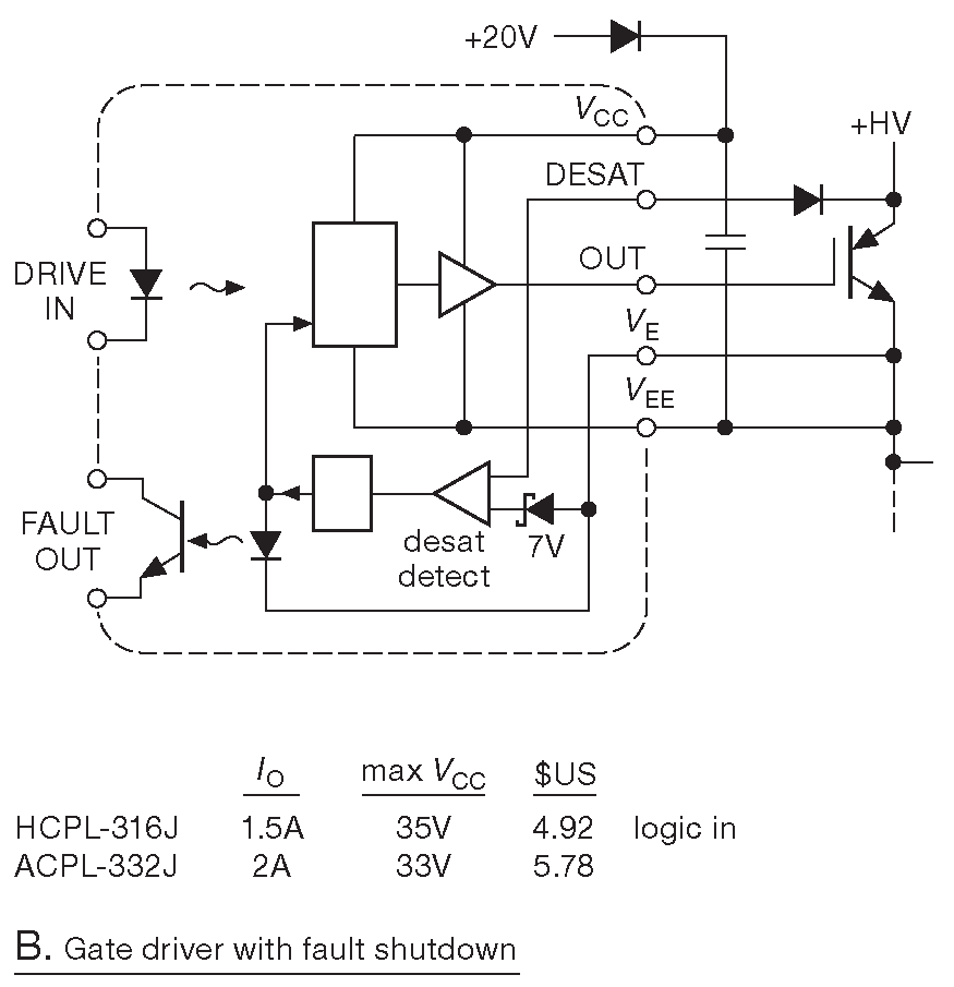 Переключение высоких потенциалов чрезвычайно опасное занятие и совершенно не подходит для скучающей публики: короткое замыкание мгновенно испаряет детали и компоненты. [* Имейте в виду, это взрывной процесс, и расплавленные остатки источника неисправности, как и случайных кремниевых свидетелей, летят во все стороны. Если кожи не жалко, то ЗАЩИЩАЙТЕ ГЛАЗА! Даже, если у вас их несколько ] . Требуется схемная защита от таких «сбоев», и схема ограничения тока подойдёт. Но даже с защитой МОП и IGBT транзисторы выгорают, потому что получают полный размах напряжения одновременно с током ограничения. В данном случае требуется отслеживать факт активации затвора IGBT, сопровождающийся отсутствием состояния насыщения. К счастью, уже выпускаются драйверы затвора с обнаружением состояния «отсутствие насыщения» ( см. рис. 12.87B ). Внутренняя схема замеряет падение на IGBT и выключает его в случае отсутствия насыщения 43 . Информация о событии отправляется через изоляционный барьер на управляющую сторону, как показано на рисунке.