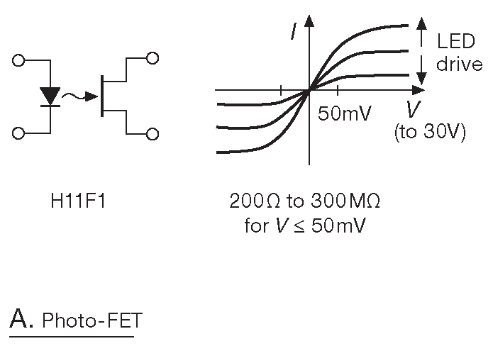 Классическая схема H11F1 ( рис. 12.88A ) ( опять разработка GE, на этот раз из 1979 года ) является полевым транзистором с оптическим управлением ( правда утверждать, что внутри именно такая начинка, авторы не готовы ). Светодиод в такой роли действует аналогично прилагаемому к затвору потенциалу: увеличение тока через него увеличивает ток насыщения транзистора ( т.е. ток канала, напряжение на котором превышает несколько десятых вольта ). При токе светодиода 25 mA ток канала достигает 1 mA . Отметим, что выход полностью симметричен и работает до ±30 V на терминалах. И так же, как с обычным полевым транзистором, для сигналов небольшой амплитуды канал выглядит почти как резистор. Таким образом, ток светодиода устанавливает величину \(R_{ON}\) , которая меняется от >300 MΩ ( в отсутствие тока светодиода ) и до 100 Ω ( при токе 16 mA ). Вновь отметим, что это симметричное относительно земли свойство и линейное вблизи нуля, но, судя по графику на рис. 12.88A , за границами ±50 mV линейность не гарантируется.
