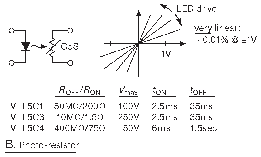 Настоящую линейность можно получить, используя фоторезистивную пару ( рис. 12.88B ), которая представляет собой резистор из CdS, освещаемый светодиодом. Прибор получается медленный и с эффектом памяти, зато с линейностью всё очень хорошо ∼0.01% для сигнала до ±1V 44 . Из такой оптопары можно сделать отличный ограничитель амплитуды для мостового генератора Вина, с малыми искажениями, как на схеме 7.22 .