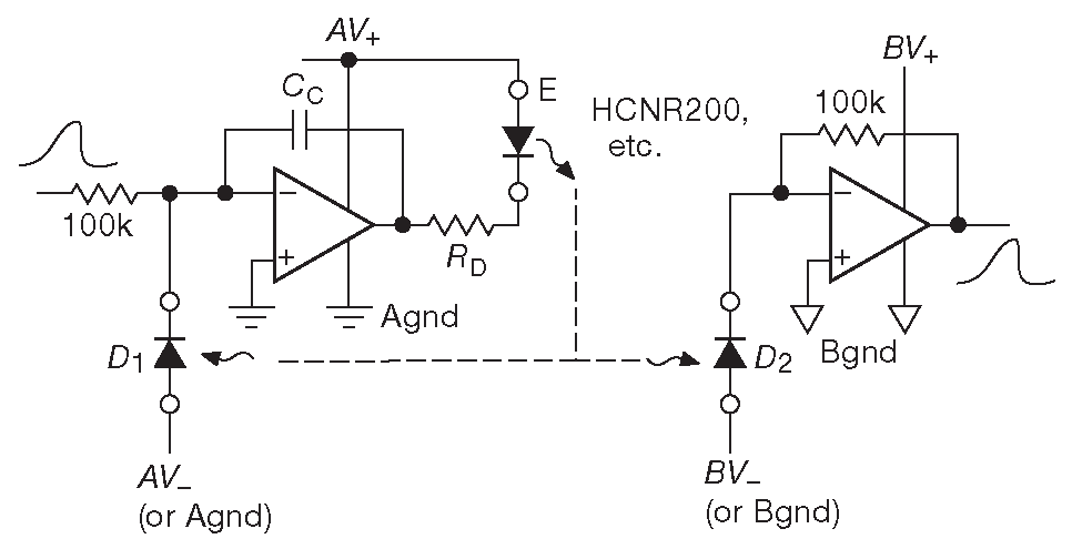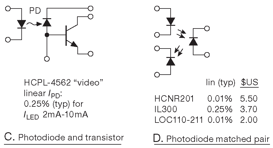 Есть небольшая группа «видео изоляторов», которые эксплуатируют естественную линейную зависимость яркости светодиода от прямого тока ( исключая начальный участок характеристики ) и хорошую линейность выхода фотодиода от освещённости. На рис. 12.88C показан пример, для которого заявляется полоса 17 MHz при использовании схемной конфигурации 12.89 . Другим путём увеличения линейности является использование согласованной пары фотодиодов с общим светодиодом. Один из фотодиодов используется для замыкания обратной связи на передающей стороне ( рис. 12.90 ). Фотодиод на другой стороне барьера будет линеен в той степени, в которой согласована пара. Компоненты, перечисленные на рис. 12.88D , достигают в такой конфигурации линейности 0.01% .