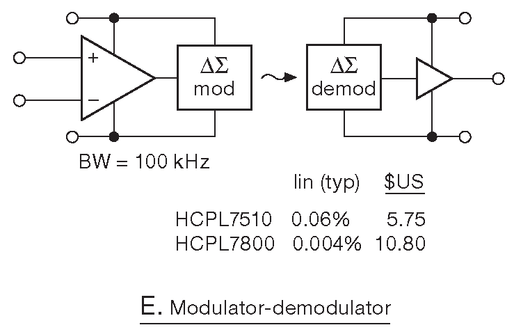 Наконец, интересным классом линейных изоляторов является пара АЦП-ЦАП, разделённая изолирующим барьером. В такой конфигурации используется «сигма-дельта» преобразование ( иногда называемое «однобитным» ), которое подробно рассматривается в §13.9 . На рис. 12.88E показана блок-схема метода. Характеристика очень линейная, но сигма-дельта процесс сам по себе ведёт к увеличению выходного шума ( ∼30 mVrms для шкалы 3V [* фигасе! что-то они хватили лишку. Урезать бы шум-то ] ) и некоторой задержке сигнала ( ∼5 μs ). Такие компоненты находят широкое применение в полумостовых трёхфазных системах управления скоростью асинхронных электродвигателей [* «частотниках» ] , где они измеряют ток каждой фазы. Полный рабочий диапазон таких схем в общем случае не превышает 300 mV .