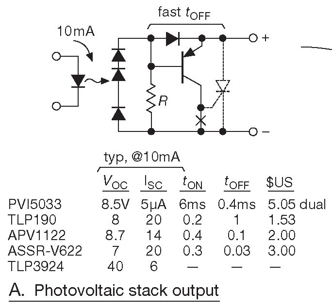 Чтобы перевести выходной транзистор в проводящее состояние в SSR используется последовательная цепочка из десятка, а то и больше, фотодиодов. Этот т.н. «фотогенераторный набор» ( PV-stack ), освещаемый светодиодом выдаёт 5...10 V на затвор. Ток цепочки всего несколько микроампер. С учётом ёмкости затвора время включения-выключения лежит в диапазоне от 0.1 до 5 ms . Если интересно поиграть с этой частью схемы, то не обязательно пилить реле: фотогенераторные элементы выпускаются в виде отдельных ИМС ( рис. 12.91A ). Справочные данные на такие микросхемы скупо дозируют информацию об их внутреннем устройстве, но по малому времени выключения ( \( t_{OFF}\) ) очевидно наличие специальных цепей разрядки затвора. В таком качестве может работать npn транзистор, который переводится в проводящее состояние, когда ток начинает снижаться, или с помощью тиристора, обозначенного пунктиром.