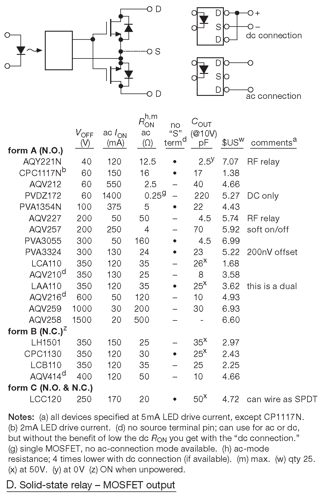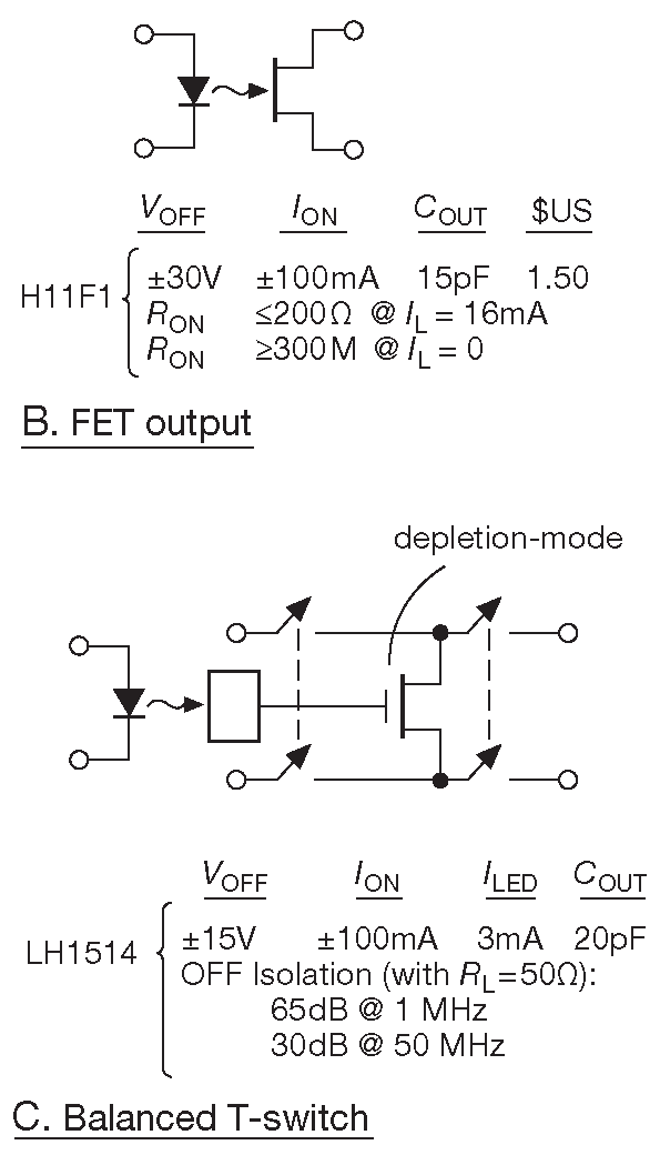 Существует некоторое количество оптореле, отмеченных на рис. 12.91B,C , с примечательными параметрами. H11F1, упомянутое ранее в качестве аналоговой оптопары, работает быстро ( ∼15 μs ) и симметрично относительно выхода, допускает до ±30 V в состоянии ВЫКЛЮЧЕНО и до ±100 mA в состоянии ВКЛЮЧЕНО, но внутренняя схемотехника неясна. У LH1514 есть интересный вариант, предназначенный для балансных [* дифференциальных ] сигналов. В нём используется Т-образная конфигурация ключей: пара нормально открытых, стоящих последовательно в каждой линии, и один нормально закрытый, перемыкающий средние точки ( МОП транзистор со встроенным каналом, подключённый к тому же PV-набору ). В результате реле имеет хорошее ослабление в состоянии ВЫКЛЮЧЕНО даже на радиочастотах ( 65 dB на 1 MHz ).