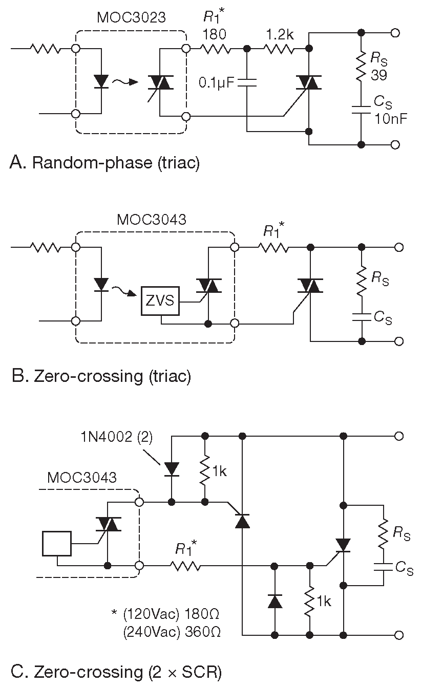 Общепринятым способом управления нагрузкой переменного тока является оптореле с симистором ( или парой встречно параллельных тиристоров ). Слаботочные SSR , показанные на рис. 12.92A,B используются для активации тиристора большой мощности ( рис. 12.93 ). Но есть и мощные оптореле, внутри которых находятся оптопара и мощный выходной симистор или пара тиристоров плюс часто схема переключения в нуле ( ZVS ). Последний компонент очень полезен для снижения наводок, т.к. включение нагрузки происходит при нулевом напряжении на линии 47 , а выключение при нулевом токе ( ZCS ) ( для тиристора это естественный ход вещей ). Таким образом, получаем готовую схему «ZVS/ZCS».