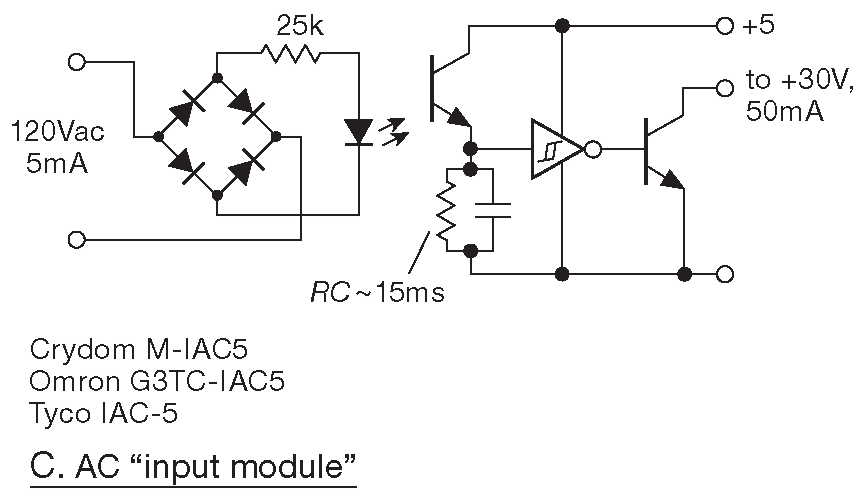 Есть группа приборов с оптоизоляцией, используемых в промышленной автоматике. Они называются «модули ввода-вывода». Входные модули наблюдают за сигналами постоянного или переменного тока и различаются величиной входного напряжения, которое достигает уровня силовой сети. Оптоизолированный выход с открытым коллектором идёт на промышленный контроллер. В выходных модулях низковольтный управляющий сигнал используется для переключения AC или DC нагрузки вплоть до сетевых напряжений. Иначе говоря, выходные модули являются простыми SSR с тиристором или транзистором на выходе, а входные - это оптопары с открытым коллектором на выходе. Последние - наиболее простой путь создания синхронного с сетевым напряжением логического сигнала. Такие устройства уже содержат внутри RC фильтр, что упрощает индикацию наличия или отсутствия напряжения, хотя и не поможет отметить конкретный цикл. Модули ввода-вывода монтируются на специальное шасси ( стандартный размер 1.7"×1.25"×0.6" и 1.7"×1"×0.4") с клеммами для быстрого монтажа и часто имеют на корпусе индикатор активности.