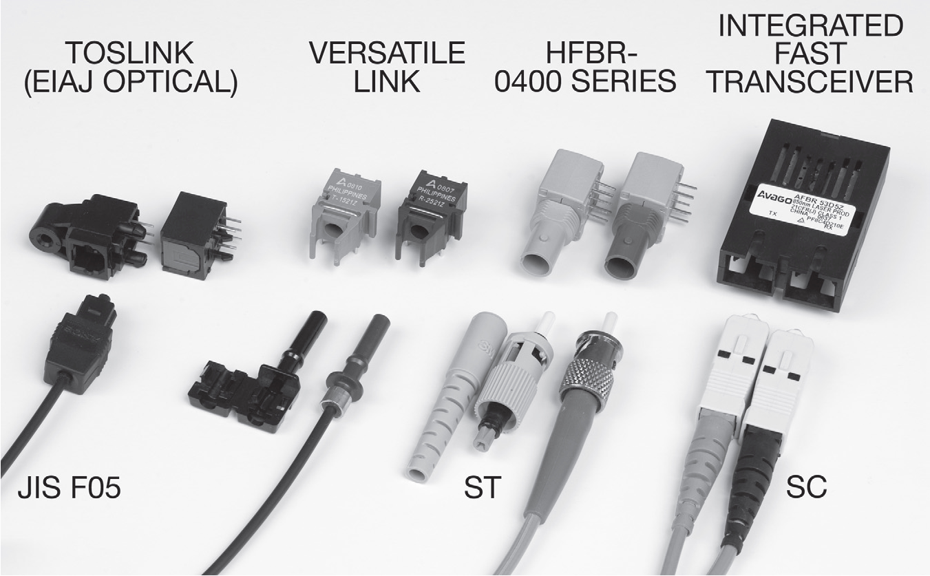 Рис. 12.95 Некоторые популярные волоконно-оптические интерфейсы. TOSLINK широко используется в потребительской электронике и здесь показан в заглушенном варианте под печатный монтаж ( справа ) и в виде открытой панельной версии. Остальные соединители могут легко собираться вручную ( для ST и Versatile Link показаны соединители в разобранном виде ), но доступны и уже заделанные варианты