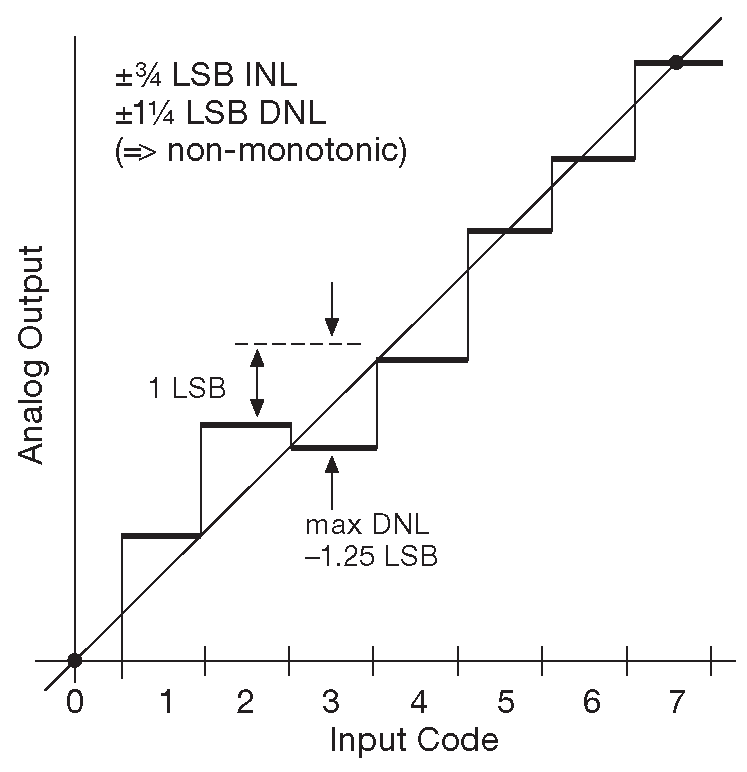 Взглянем на рис. 13.21 и 13.22 . Оба представленных там ЦАПа имеют ошибки линейности, но есть нюанс, поэтому сначала несколько определений. Интегральная нелинейность ( INL ) - максимальное отклонение от идеальной прямой линии преобразования цифрового входа в аналоговый выход по всему диапазону преобразования 27 . Дифференциальная нелинейность ( DNL ) - максимальное отклонение разницы между аналоговыми представлениями двух любых соседних цифровых значений ( n=2 и n=3 в приведённом примере ) от корректной величины 1 LSB .