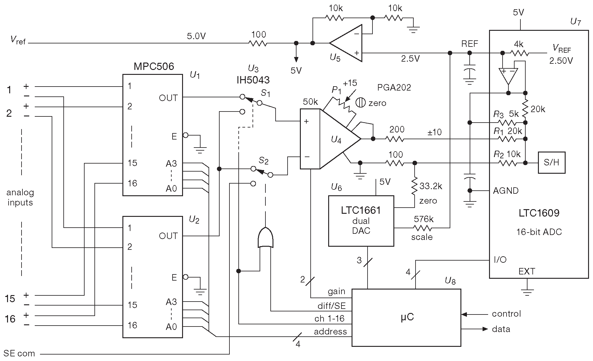 В этом устройстве на основе одного АЦП последовательного приближения создаётся 16-разрядная измерительная система . Рис. 13.76 представляет схемную конфигурацию, которая позволяет оцифровать любую комбинацию 16 дифференциальных или 32 однополярных аналоговых входов под управлением микроконтроллера ( последний является предметом рассмотрения в Части 15 ). Например, любые входы можно «на ходу» переключить из однополярного в дифференциальный режим и поменять для них коэффициент усиления. Каналы можно опрашивать в любой последовательности с пропуском или без оного и с программируемыми задержками между соседними выборками. Такого рода устройства могут образовывать «измерительный блок» для экспериментов, управляемых программно, которых может потребоваться быстро просмотреть десятки напряжений с выборками через определённые промежутки времени.