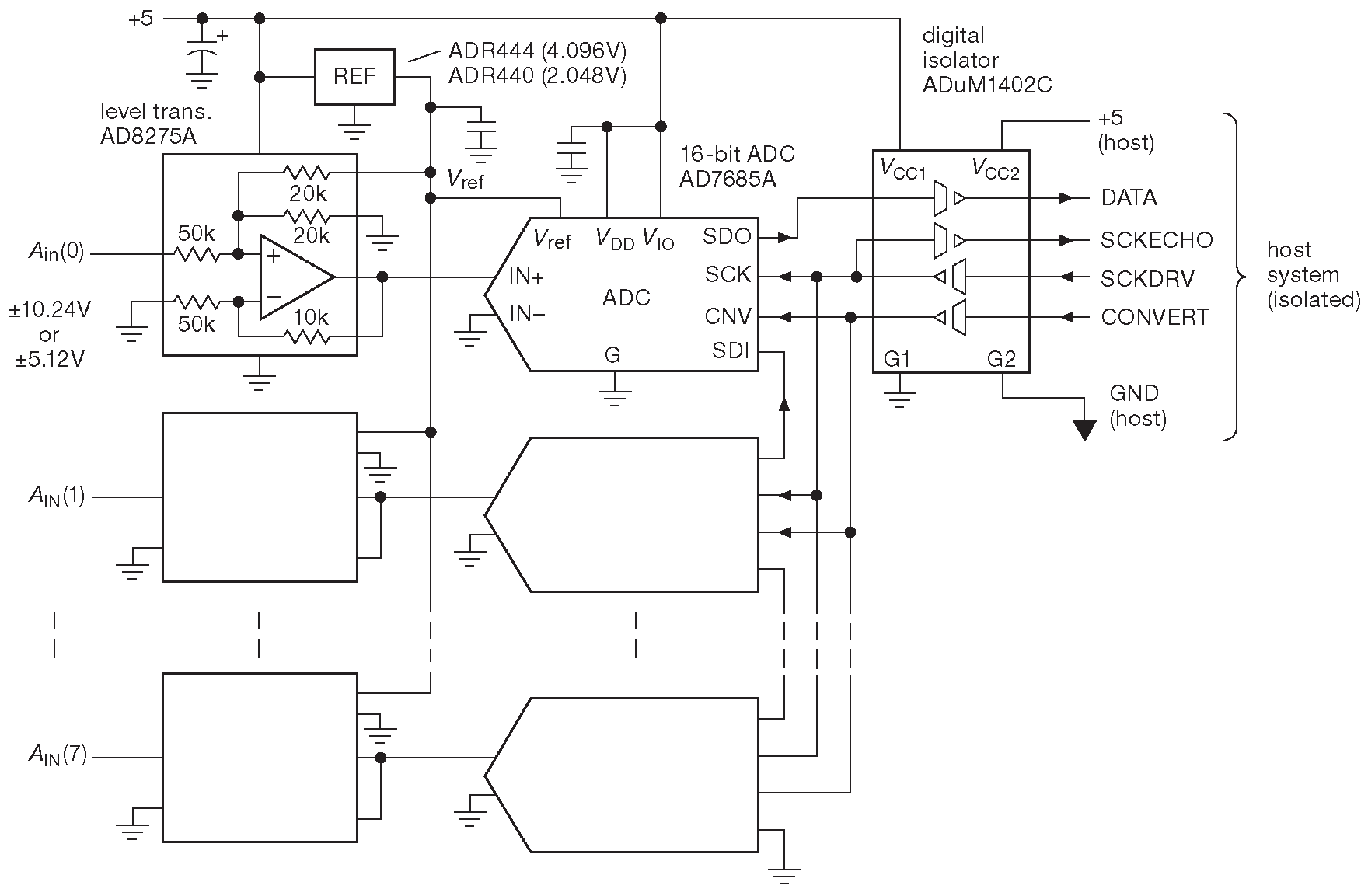 В схеме использованы возможности интересной микросхемы AD8275 - буфера для АЦП со сдвигом уровней, который делает именно то, что требуется. Исходно это простой разностный усилитель с \( G = \) 0.2 с выводом сдвига уровня. В приведённой схеме он преобразует биполярный сигнал ±10.24 V в положительный 0—4.096 V . У буфера достаточный запас по рабочей полосе ( время установления до 0.001% , т.е. меньше LSB, 0.45 μs ), RR выход, а значит, он может работать от тех же +5V , что и АЦП, полностью исключая возможность перегрузки АЦП, точное и стабильное усиление ( \(G = \) 0.2±0.024%, 1 ppm/°C max ) и достаточно низкие смещение и дрейф ( \( V_{os}\) < 0.5 mV max, 7 μV/°C max ).