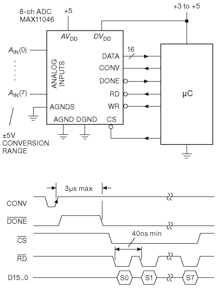 Зачем делать, если можно купить? Как это обычно бывает, предприимчивые граждане из Maxim собрали в одну микросхему MAX11046 восемь 16-разрядных АЦП последовательного приближения с параметрами, сравнимыми с только что описанным устройством. 250 ksps , однополярное питание +5V , биполярный входной диапазон ±5V , хорошая точность и линейность ( смещение не больше ±0.01% , типовой температурный коэффициент смещения ±2.4 μV/°C , без пропущенных кодов, максимальная интегральная нелинейность ±2 LSB ). MAX11046 имеет параллельную шину данных и отдельное питание интерфейсной части для совместимости с низковольтовыми микроконтроллерами. Схема включения показана на рис. 13.79 .