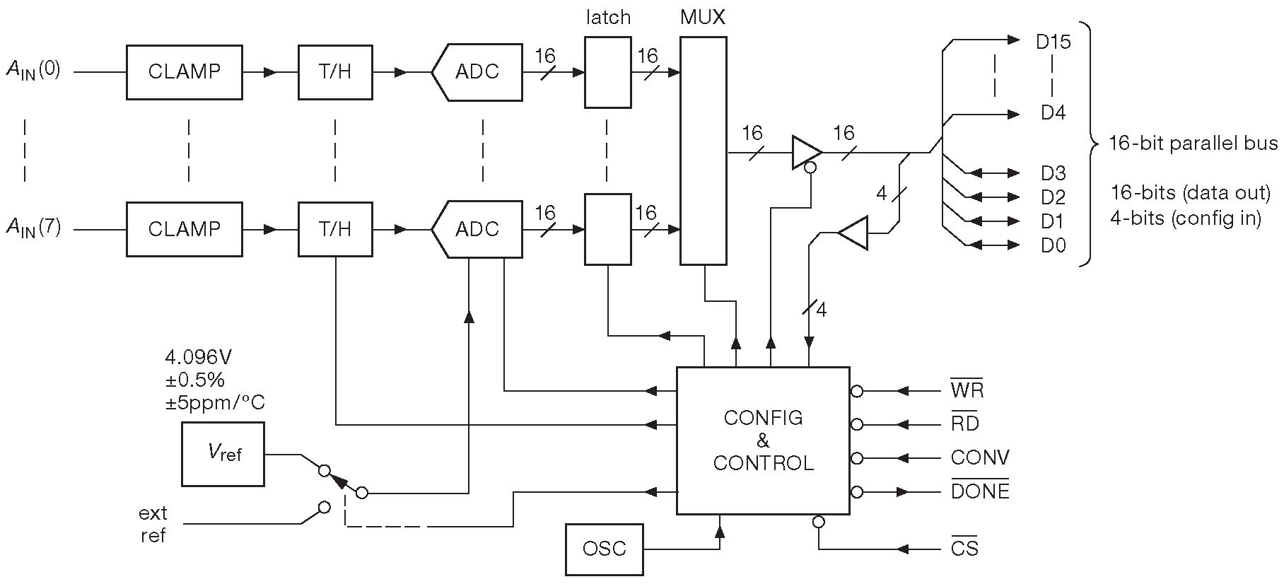Особенностью кристалла является двуполярный входной диапазон при однополярном питании 115 . Единый вывод «CONV» запускает преобразование на всех каналах сразу. Выборка производится по возрастающему фронту «CONV», причём разброс между каналами не более 0.1 ns (!). Преобразование продолжается 3 μs , после чего можно прочитать по параллельной 16-разрядной шине результат - один канал на один импульс по выводу «/RD».